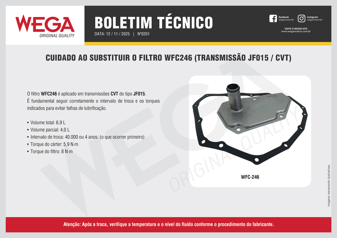 View Larger Image nº0201 – Boletim técnico – CUIDADO AO SUBSTITUIR O FILTRO – WFC-246 Por WEGA MOTORS BR|2026-02-02T12:10:59+00:002 de fevereiro de 2026|0 Comentários Compartilhe este Post! FacebookTwitterRedditLinkedInWhatsAppTumblrPinterestVkXingE-mail